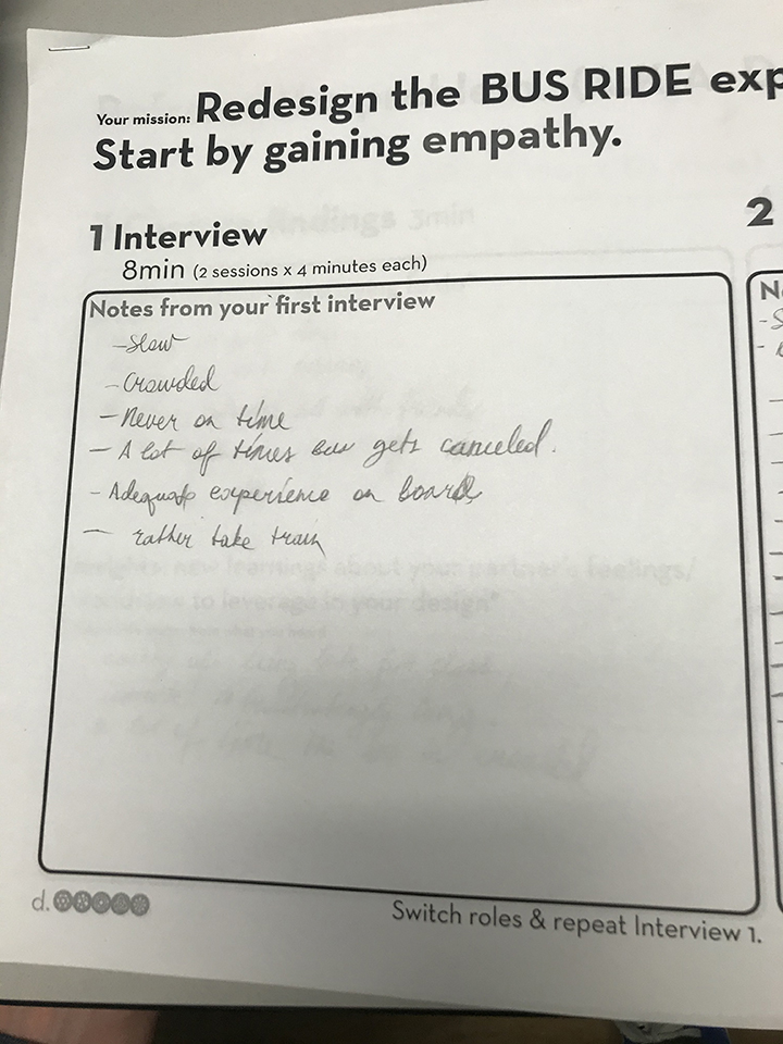 Our first assignment involved interviewing a group member on their experience with Septa, specifically on the route that runs through the campus and into Center City. We only had 4 minutes to ask questions and write down the responses.